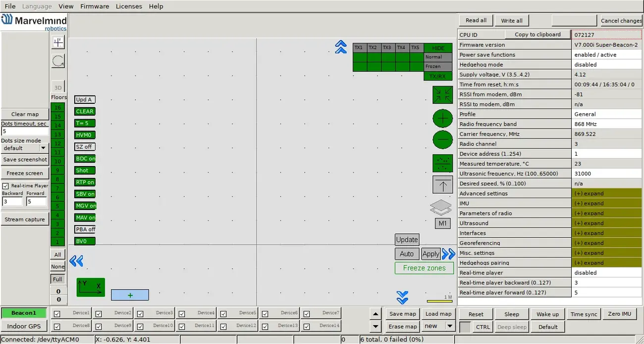 • marvelmind hedge_rcv_bin node which is able to communicate with mobile beacon or modem and provide received location and other data