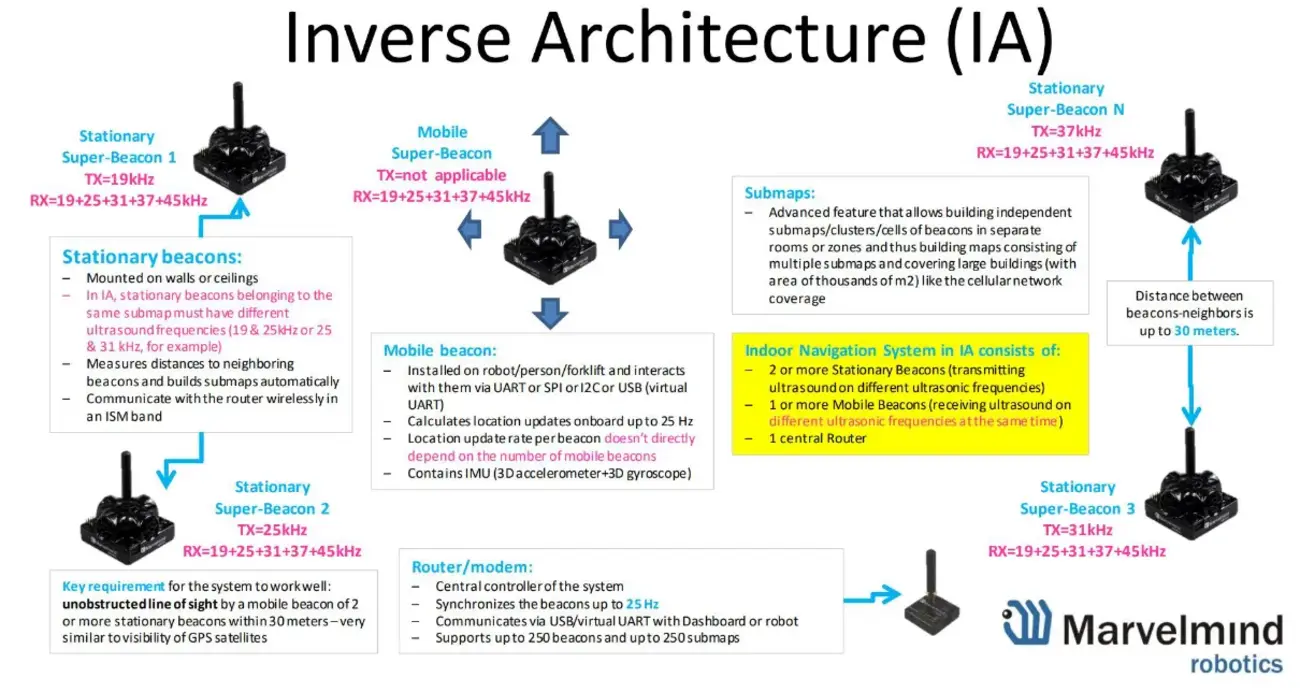 Marvelmind provides a few architectures for their system. This tutorial is configured for Inverse Architecture (IA):