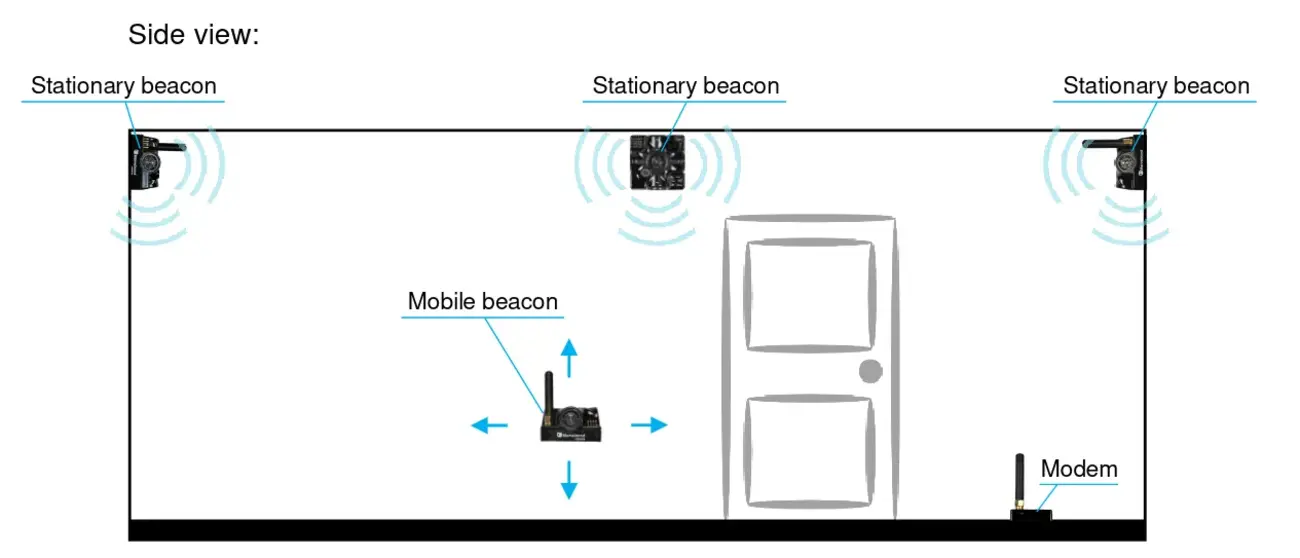 Place the stationary beacons high on the walls vertically in a way that will provide optimal ultrasonic coverage (make sure that the antenna is in the upper right corner of the beacons).